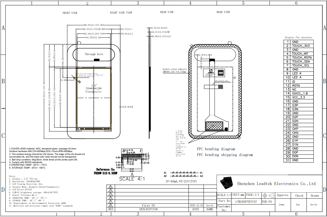 The LTK050FTBIT47-V0 is a 5.0-inch TDDI color display module designed for modern smart applications. Featuring a MIPI interface and IPS technology, it ensures stable performance and wide viewing consistency. With a brightness of 500 cd/m², it is suitable for both indoor and semi-outdoor environments. Its compact structure and robust design support reliable operation across a wide temperature range from -20°C to +70°C.This module is ideal for smart transportation and smart home solutions, including applications such as smart door locks and home monitoring systems, offering a dependable and efficient display solution for next-generation devices.
