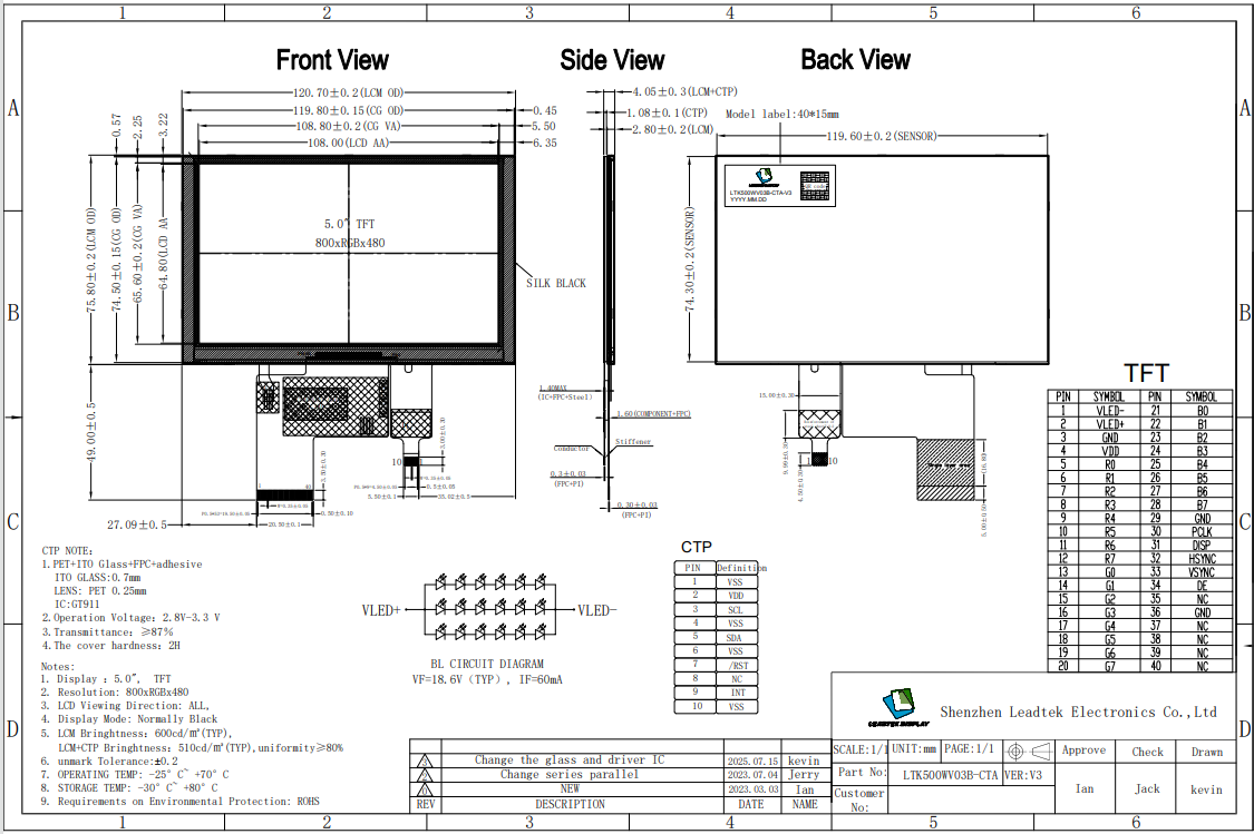 LTK500WV03B-CTA-V3 is a color active matrix thin film transistor (TFT) liquid crystal display (LCD) that uses amorphous silicon TFT as a switching device.