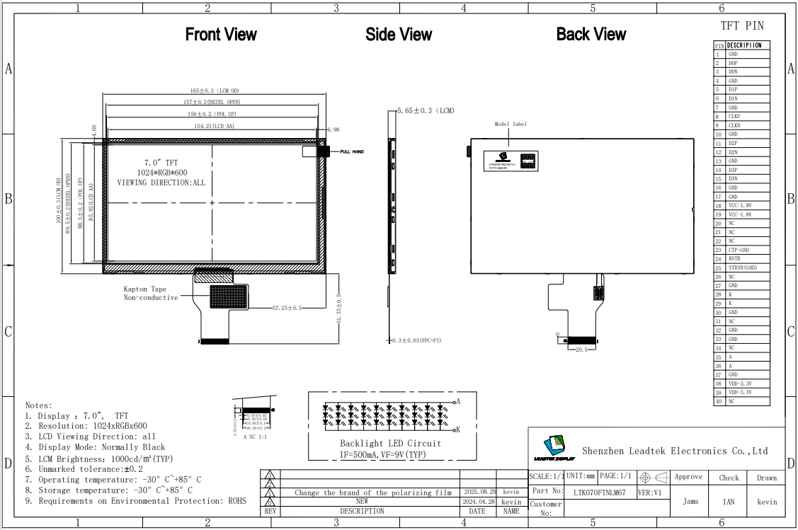 The LTK070FTNLM67-V1 is a 7-inch IPS display ideal for industrial applications. It features a resolution of 1024x600 for clear and sharp visuals. The high brightness level of 1000 cd/m² ensures excellent readability even in bright environments. The display's active area is 154.21x85.92 mm, with overall dimensions of 165.00x99.20x5.65 mm.Designed to withstand harsh conditions, it operates effectively in temperatures ranging from -30°C to +80°C. It is suitable for various harsh environments, waterproof, dustproof and anti-static