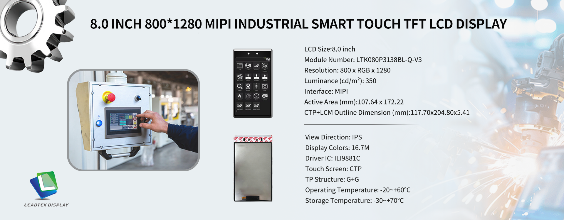 We are thrilled to introduce our 8.0-inch MIPI LCD Module ——LTK080P3138BL-Q-V3. This cutting-edge display solution combines superior visual quality, responsive touch functionality, and exceptional durability, making it the ideal choice for a wide range of applications in the smart industrial sector.