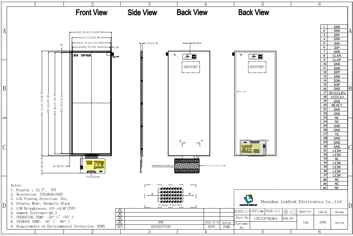 LTK123FTHLM24-V0は、先進的な産業用およびスマートディスプレイ用途向けに設計された12.3インチIPS LCDモジュールです。 720×1920の高解像度と450cd/m²の高輝度により、鮮明な映像と優れた視認性を実現します。IPS方式の視野角技術により、どの角度から見ても安定した画質を提供します。MIPIインターフェースを搭載し、高速かつ効率的なデータ伝送が可能です。ノーマリーブラックの透過型ディスプレイモードを採用しており、高コントラストで現代的なビジュアル表現を可能にします。スリムな外形と広いアクティブエリアを備え、制御パネル、自動車用ディスプレイ、HMIシステムに最適なモジュールです。