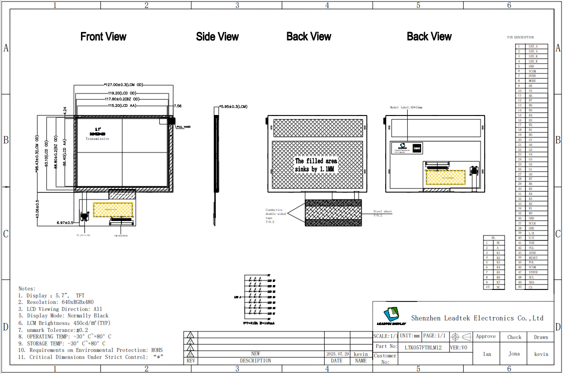 LTK057FTBLM12-V0は、解像度640×480の5.7インチTFT液晶ディスプレイモジュールです。IPSテクノロジーを採用し、広い視野角と安定した色再現性を実現しています。輝度は450cd/m²で、厳しい照明条件下でも鮮明な視認性を確保します。24ビットRGBインターフェースに対応し、拡張可能なLVDS接続を備えているため、様々なシステム統合に柔軟に対応できます。