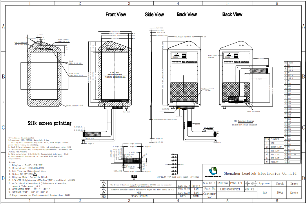 この5.5インチIPSディスプレイは、最大1080x1920の解像度を持ち、MIPIインターフェースを搭載し、最大680 cd/m²の輝度を提供します。表示エリアは68.04 (H) x 120.96 (W) mm、全体サイズは80.00 (W) x 211.11 (H) x 3.30 (D) mmです。キャパシティブタッチスクリーン(CTP)が搭載されており、タッチスクリーン構造はGFFです。動作温度範囲は-20°Cから+70°C、保存温度範囲は-30°Cから+80°Cです。産業用途の特殊なアプリケーションに適しており、手袋を着用したタッチ操作や過酷な環境にも対応しています。
