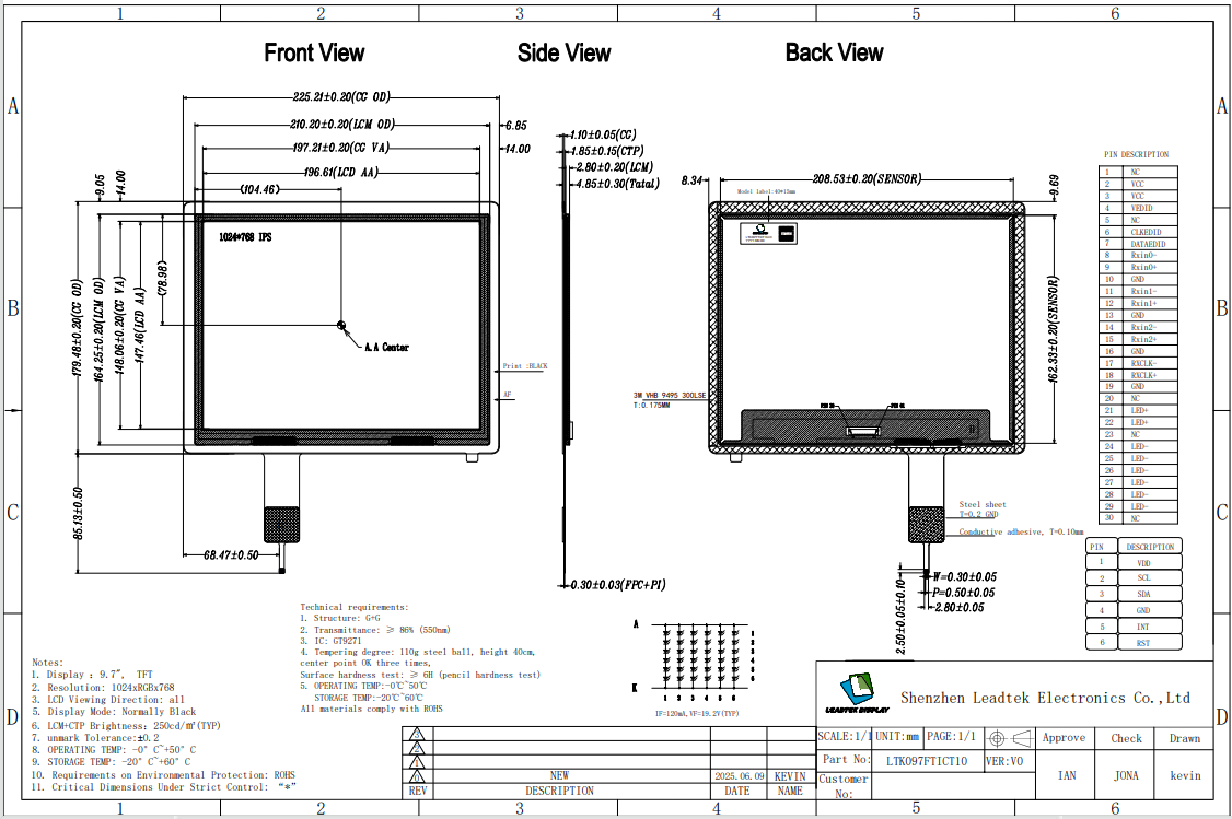 9.7インチIPS液晶モジュール(モデル LTK097FTICT10-V0)は、1024×768の解像度を備え、広視野角と安定した色再現性を実現しています。GT9271タッチコントローラーとIICインターフェースを採用したG+G構造の静電容量式タッチパネルを搭載しており、応答性が高く耐久性にも優れています。モジュールはLVDSインターフェースに対応しており、さまざまな端末機器への組み込みが容易です。動作温度範囲は0~50°Cで、屋内の商用用途に適しています。本製品は、スマートホーム制御パネル、レストランやスーパーマーケットのセルフレジ端末、その他中型サイズのタッチディスプレイを必要とする人間・機械インターフェース(HMI)用途に最適です。