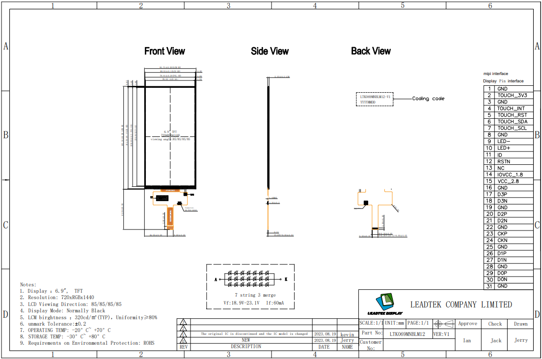 6.9インチのLTK069MNBLM12-V1ディスプレイは、鮮明な720×1440解像度と鮮やかなIPS技術を提供し、スマートホームデバイスに最適です。輝度320 cd/m²により、さまざまな照明条件下でもクリアな視覚体験を確保します。MIPIインターフェースとGC9703CドライバーICにより、シームレスな統合とパフォーマンスを実現します。