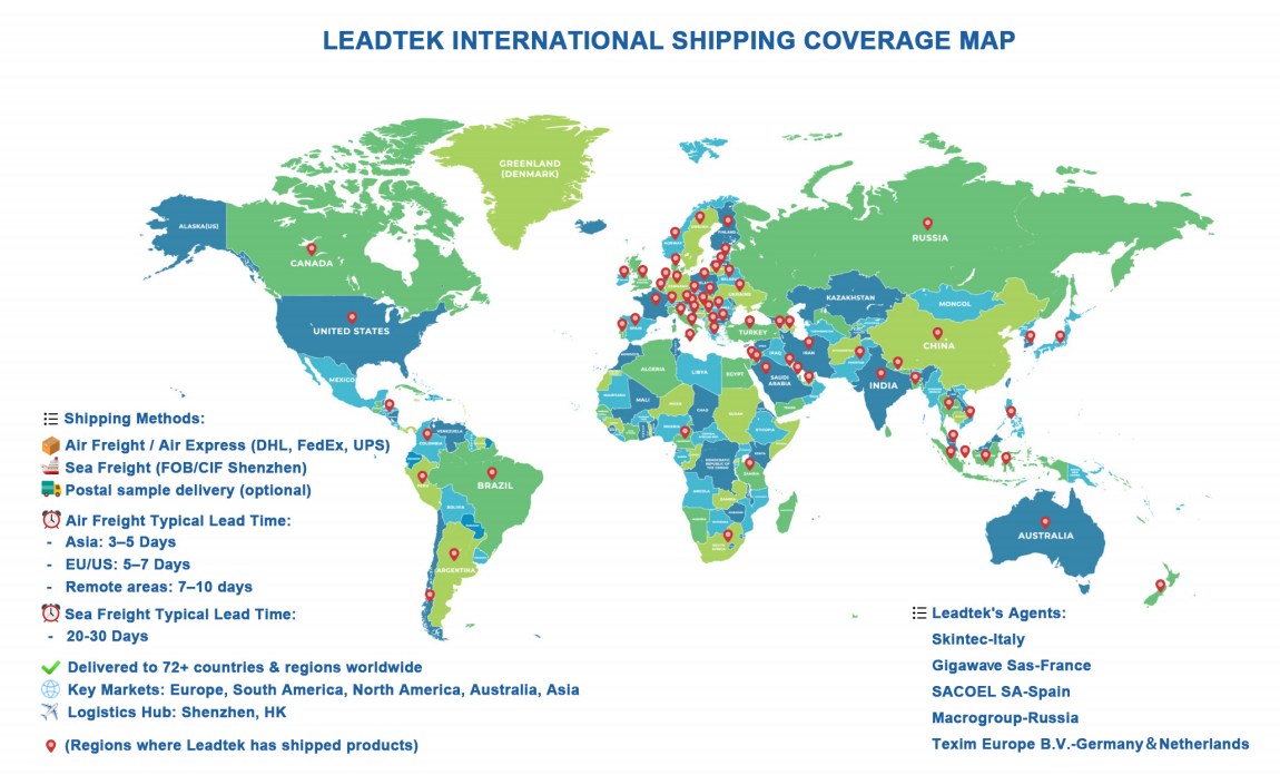 Leadtekは、強力な物流ネットワークを駆使し、世界72以上の国と地域への配送実績を誇ります。ヨーロッパ、南米、北米、オーストラリア、アジアのどこへでも、お客様のニーズにお応えします物流拠点:深圳と香港