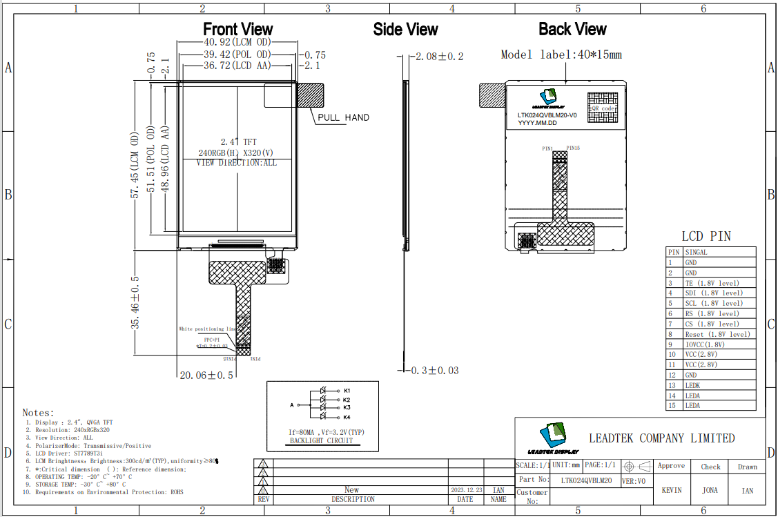 このLTK024QVBLM20-V0 IPS LCDモジュールは、240×320ピクセルの解像度を特徴としており、SPIインターフェースを介して300 cd/m²の輝度で動作します。アクティブエリアのサイズは36.72×48.96mmで、全体の寸法は40.92×57.45×2.46mmです。カバーガラス(CG)技術を搭載しており、-20℃から+70℃の温度範囲で安定して動作し、保管条件は-30℃から+80℃です。スマートホームアプリケーション向けに設計されており、さまざまな家庭環境でクリアで高品質なビジュアルと安定したパフォーマンスを提供します。