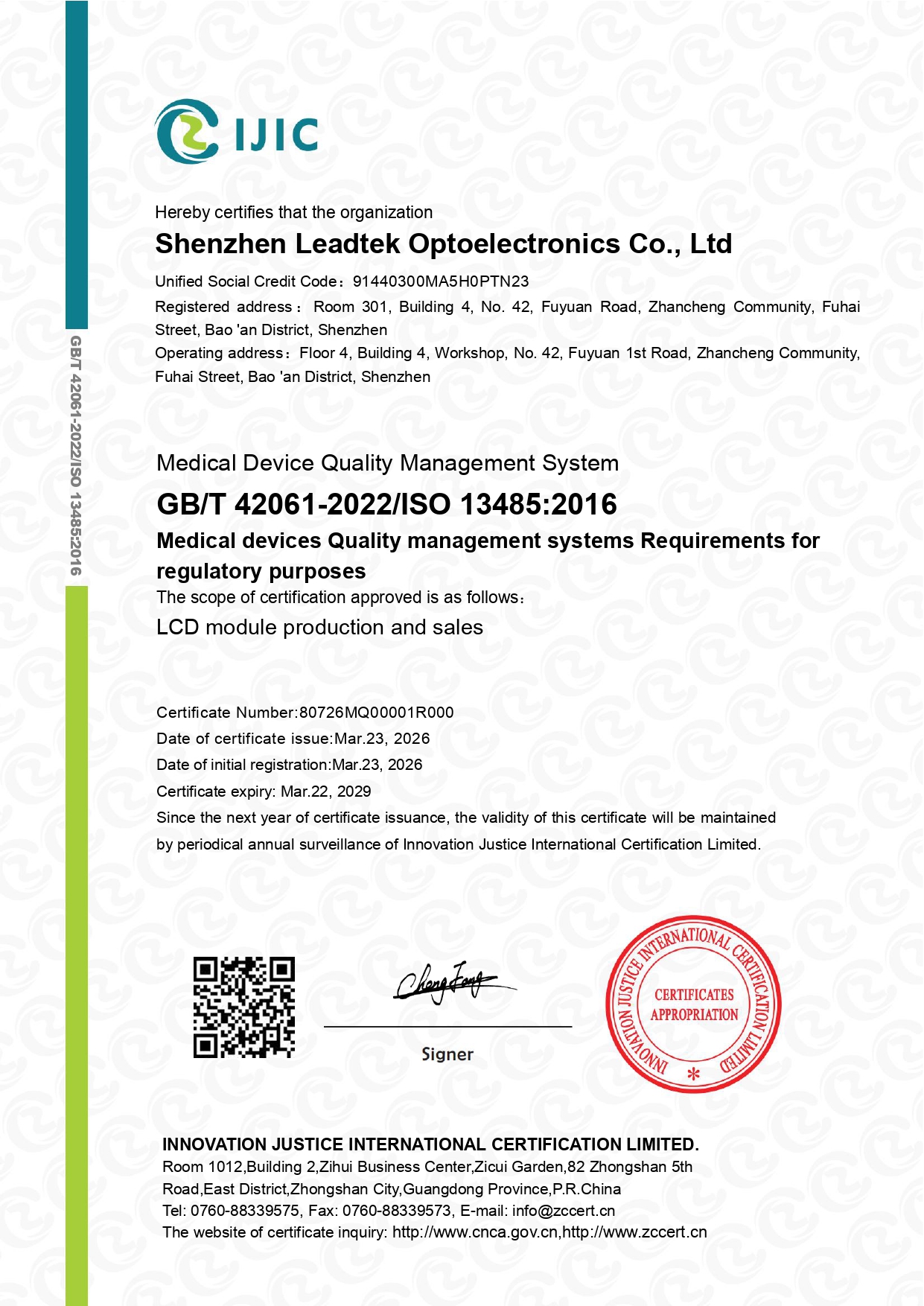 Leadtek Displayは、このたび当社の製造拠点であるShenzhen Leadtek Optoelectronics Co., Ltd.が、ISO 13485:2016 医療機器品質マネジメントシステム認証を更新し、有効期限が2029年3月22日まで延長されたことをお知らせいたします。