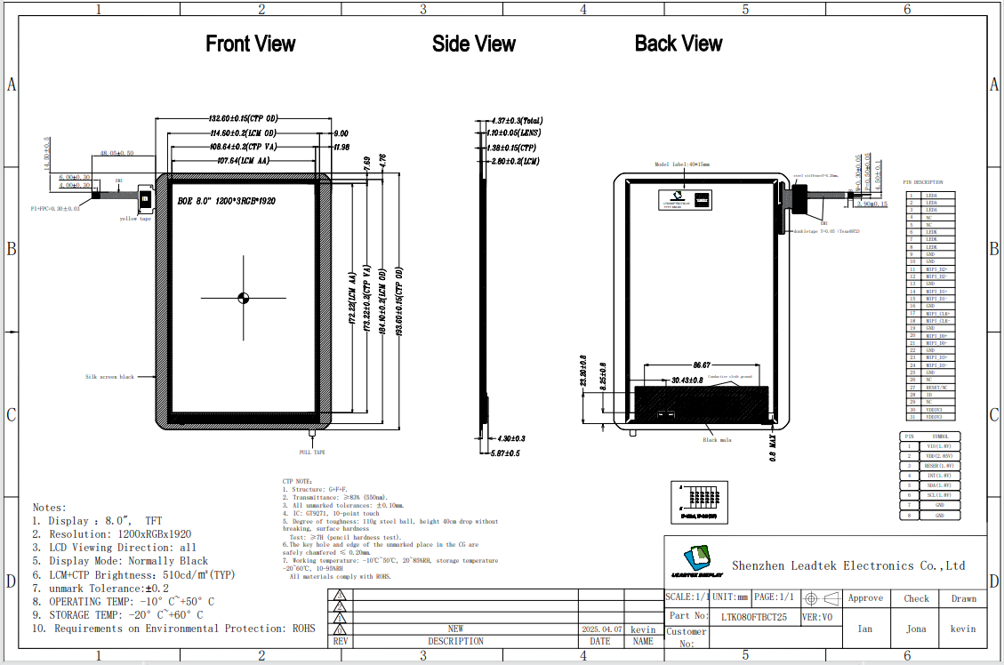 The LTK080FTBHT25-V0 model has an IPS viewing angle and a resolution of up to 1200*1920, which can provide clear viewing. The size is 132.60*193.60*3.60(mm), and the effective area is 107.64*172.22(mm), with ample display space. It is connected via the MIPI interface. The operating temperature range is-0~+50℃and the storage temperature range is -10~+60℃, suitable for application in smart industry.